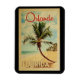 Ein einzigartiger Retro-Kunstdruck aus der Mitte des Jahrhunderts in Orlando Florida im Vintage-Reiseplakatstil. Es verfügt über eine geschwungene Palme am Sandstrand mit Ozean unter einem blauen bewölkten Himmel.