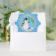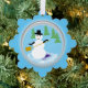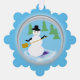 Schneemann mit Schaufel ist bereit, den Schnee aus seiner Schneedecke zu reinigen. Grüne Kiefernbäume stehen hinter ihm. Text auf der Rückseite "Die besten Wünsche für die Urlaubssaison"