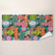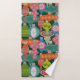 Dieses Handtuchhandtuch ist mit einem erbsengrünen Waschlappen, einem orangefarbenen Handtuch und einem Badetuch ausgestattet, das in einem weihnachtlichen, farbenfrohen Jumble verschiedener Ornamente gehalten ist.