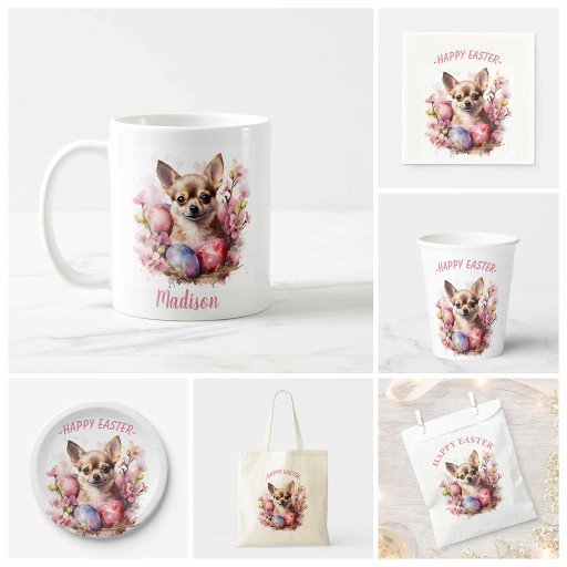 Tasse mit Chihuahua mit Blume und Ostereiern. Personalisierbar.