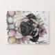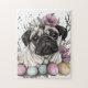 Osterblütenpuzzle im Mops. Rustikale Aquarellfarben und Mops in Lineart Pastellfarben mit Ostereiern und Blumenbotanicals.