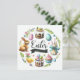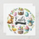 Das Bild ist eine farbenfrohe und festliche Osterillustrierung. Es besteht aus folgenden Elementen, die kreisförmig angeordnet sind: 1 Ein niedlicher Hase mit blauem Kragen. 2 Ein gelbes Küken. 3 Dekorative Ostereier, einschließlich gestreifter, fester und gesprenkelter Designs. 4 Blumenelemente wie kleine Blume und grüne Blätter. 5 Ein mattierter Kuchen mit bunten Ostereiern. 6 Ein Glas Leckereien, die mit einem blauen Band verbunden sind. 7 Ein rosafarbener Kuchen mit geschraubtem Zuckerguss. 8 Das Wort "Ostern" wurde in elegantem Schrift prominent geschrieben, darunter ein schwarzes Band. Das Gesamtbild vermittelt eine fröhliche und feierliche Osteratmosphäre.