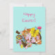 Ein niedliches orangefarbenes Tabby, das in einem Osterkorb sitzt und einen lila gestopften Hasen umarmt, und das ganze Süßigkeiten ist auf dem Boden um ihn herum