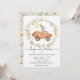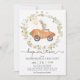 Hopp auf zur Osterbrunch und Ostereiersuche! Lade deine Gäste mit dieser supersüßen Einladung zu deiner Party ein, die einen niedlichen Hasen zeigt, der ein Karottenauto fährt, umgeben von einem üppigen Wildblumen-Kranz.