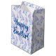 Blauer und lila Geschenksack wünscht ein glückliches Ostern.