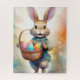 Puzzle eines fröhlichen Kaninchens in blauer Kleidung mit einem Korb voller bunter, dekorierter Eier. Der Hintergrund zeichnet sich durch sanfte Blumendetails und sanfte, warme Farben aus.