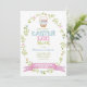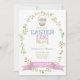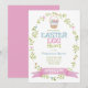 Ostereier Jagd Einladung mit Pastellfarben und hübschen blumenreichen ovalen Kranz und Ostereier Korb.