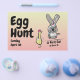 Ein raskisches Kaninchen, das einer Mutter den Weg gibt, ihre Eier zu finden, während es sie hinter seinem Rücken versteckt. Holen Sie sich ein paar Kinder, um ihr zu helfen, indem Sie diesen Flyer für Ihre Ostereierjagd anpassen.