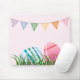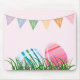 Farbenfrohe gestreifte Eier sitzen im grünen Gras auf einem schwarzen Lavendel-Hintergrund mit einem "Spring"-Banner. Klicken Sie auf "Anpassen", um personalisierten Text hinzuzufügen oder die Hintergrundfarbe zu ändern; falls gewünscht.