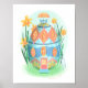 Auf einem pastellfarbenen Ostereig steht ein winziger Tisch im Freien, der sich unter den gelben Narzissen befindet. Original Illustration von Noël Snow.