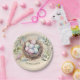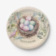Farbenfrohe Ostereier werden in einem Vogelnest unter grünen Blätter ausgestellt, um den Frühlingsurlaub auf diesem hübschen Teller zu begrüßen. Ein kleiner rosa und gelber Vogel sitzt auf einem Blatt in der Nähe und fragt sich, wie diese Eier im Nest got sind. Der Hintergrund ist eine Aquarellcreme, während die grünen Zweige das Nest umgeben. Fügen Sie unten eine benutzerdefinierte Meldung hinzu. Ideal für den Osterbrunch oder das Mittagessen, oder für eine Familie und Freunde, die Eizelljagd zu Ostern. Verfügbar mit passenden Produkten.