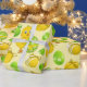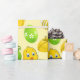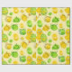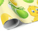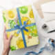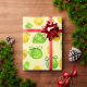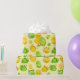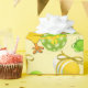 Niedlicher Osterhühner-Cartoon mit blauen Augen, mit einem hellgrünen Osterei mit kleinen Blume, gelbem Band und schönen glänzenden Ostereiern in gelben und grünen Mustern. Frohe Ostern!