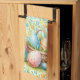 Ein Hübsches, pastelfarbenes Küchentuch für Ostern, Gemustert in bunten Eiern und Weißen Frühlingsblumen mit einem Korb von Ostereiern