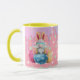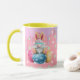 Niedlicher Ostergenom mit sonnigen Ohren, auf dekorierten Eiern auf rosa Untergrund von Minze und weißen Punkten mit pastellfarbenen Süßigkeiten Tropfen sitzend.