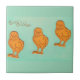 Eine Vintage, antike Osterpostkarte mit drei schwammig gelben Filzkichern in Folge. Hintergrund in blau. Frohe Ostern!