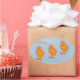 Eine Vintage, antike Osterpostkarte mit drei schwammig gelben Filzkichern in Folge. Hintergrund in blau. Frohe Ostern!