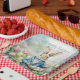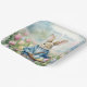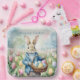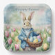 Aquareller Osterhase mit einem Korb von Ostereiern auf einer Wiese von bunten Tulpen Gruß Ostern