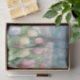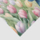 Aquareller Osterhase mit einem Korb von Ostereiern auf einer Wiese mit bunten Tulpen