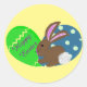 Happy Oaster geschrieben in lila Text auf grünlich gestreiftem Ei auf einem hellgelben Hintergrund mit blauen Polka gepunktetem Ei und niedlichem braunen Hasen mit großen rosa Hasen Ohren und Cottontail hopping zu den dekorierten Eiern. Original Artwork von TamiraZDesign.
