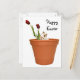Hasen flüchtige Blicke aus einem Blumentopf mit Tulpen, um ein glückliches Osteroester-Foto zu wünschen