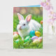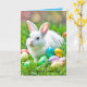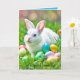 Weißer Hasen mit bunten Ostereiern im Gras. Alle Texte können geändert werden.
