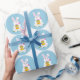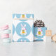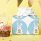 Ein niedlicher Osterhase mit einem rosa Bugband, der so glücklich am Ostereier festhält, der in Frühlingstönen mit Süßigkeiten geschmückt ist, die auf einem grünen Gras mit einem Rotkehlchen-Ei-Kreis sitzen. Benutzen Sie dieses, um ein Geschenk für ein kleines oder großes Mädchen oder einen Jungen oder eine Familie oder einen Freund zu verpacken, um ihnen ein glückliches Ostern zu wünschen.