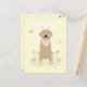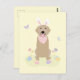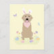 Eine niedliche Abbildung eines Golden Retriever Hundes mit sonnigen Ohren und einer niedlichen Osterbandana. Umgeben von verzierten Ostereiern, Frühlingsblumen und Schmetterlingen.