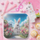 Ein niedliches Osterhasen, flüchtige Blicke über einen Haufen Zaun, umgeben von farbenfrohen Tulpen und einem hellen Frühlingsgarten.
