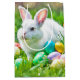 Weißer Hasen mit bunten Ostereiern im Gras. Text kann geändert werden.