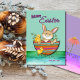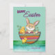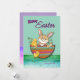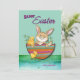 Niedlich Happy Oaster Illustration , handgemalt , mit Osterhasen in Eichel mit Küken . Die Muschel ist geknackt und mit Regenbogenfarben gefüllt. Aktualisieren Sie den gesamten Text ganz einfach nach Ihren Wünschen. Die Rückseite der Karte hat einen lila Hintergrund mit einer Blume. Frohe Ostern!