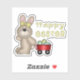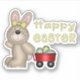 Dieser niedliche Osteraufkleber zeigt ein wenig braunes Hasen mit einem gelben Bogen, der einen roten Wagen mit verzierten Ostereiern zieht. Der stilisierte Text über dem Wagen sagt "Happy Oaster" in pastellgelb.