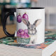 Niedliches graues und weißes Osterhasen mit Cerise und lila Polka gepunktete Ostereier in einem schwarzgrünen Korb - zusammen mit zwei Ostereiern, die von oben auf dieser Osterkaffee-Tasse hängen. Passen Sie die Vorderseite und das Zentrum dieser Ostertheater Tasse mit Ihrem Namen an. Ändern Sie bei Bedarf den Schriftart und die Farbe des Schriftartes. Viel Spaß! Das ist ein großartiges Ostergeschenk.