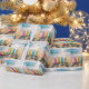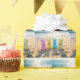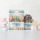 Vier farbenfrohe Ostersonnige Bonbons in Rosa, Gelb und Blau stehen an einem Sandstrand mit dem Ozean im Hintergrund