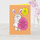 Cartoon-Abbildung eines niedlichen Osterhasen mit einem "eggstra" großen Osterei mit einem Rätsel auf dem Ei. Die Antwort ist innen zusammen mit einem "eggstra" besonderen Gruß. Kopieren kann geändert werden.