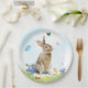 Die niedlichen Osterpapiere Teller mit einem furiosen braunen Hase mit einem Damenbug auf dem Kopf, Babychick, lila Krokus, Kleeblatt und Schmetterlinge, alles in einer grasbewachsenen, Frühlingswiese mit blauem Himmel. Personalisieren Sie mit Ihrem Namen oder Gruß.