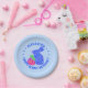Blaues Themed Geburtstags-Party-personalisierte kundenspezifische kleine Papierplatte Osterhasen-Osterei-buntes Kaninchen-Spaß-Ostern. Kann besonders angefertigt werden, um die Hintergrundfarbe zu ändern und/oder einen Namen, Initialen oder Spaßmitteilung zu addieren. Dieser Osterhase mit Ostereiern ist kein Peter-Waldkaninchen. Hell und voll von der Farbe, ist er der Ostern-Korb, das farbige Gras und die Geleebonbone, die ganz oben in einem gerollt werden und passt über seinen Juweltoneiern auf. Spaß-Osterhase mit Ostereiern, die in meinen Scheiben der Farbart, diese bunten Symbole des Frühlinges getan werden, sind zu einem glücklichen Ostern-Feiertag bereit. Häschen-Kaninchen getan in den Schatten des Blaus mit lila, rosa und grünen Ostereiern.