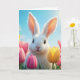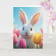 Ein flauschiges weißes Kaninchen mit großen Ohren ist von farbenfrohen Tulpen umgeben, die unter einem hellen, sonnigen Himmel liegen. Text kann geändert werden.