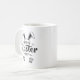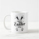 Das Design enthält den Text "Happy Oaster Day" in einem dekorativen Schriftart. Über dem Text befinden sich Illustrationen von sonnigen Ohren, und unter dem Text sind Bilder von sonnigen Pfotendrucken. Die Tasse wird auf einer hellen, möglicherweise marmorfarbenen Fläche platziert. Das Gesamtthema ist festlich und bezieht sich auf Ostern.