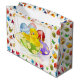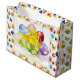 Eine schöne große Geschenktasche, die mit einem farbenfrohen Osterküken, umgeben von farbenfrohen Eiern, gestaltet wurde