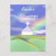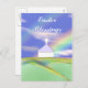 Postcard mit meiner hübschen pastellfarbenen Szene einer Kirche und Kreuz auf grünen Hügeln mit Regenbogen und blauem Himmel oben.