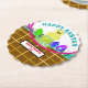 Hippity-Hoppity Typografie in rot in schwarz-weißem geometrischem Rechteck. Zweifarbiger Osterkorb mit rosa und grünem Ostergras und rosa Tropfgriff. Happy Ostertypografie in Himmelblau und Gelb. Niedliches gelbes Küken aus gelb blau gestreiftem Ei mit dekorierten Eiern geschlüpft. Original Artwork Design © TamiraZDesign.