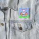 Ein Knopf mit meinem originalen Computerwerk eines kleinen Lamm-Charakters, Korbkörben aus Ostereiern und leuchtenden, farbenfrohen Blume. Im Text steht "Happy Oaster!"