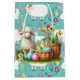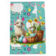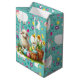 Eine mittelgroße Geschenktasche in Türkis mit weißen Lämmern und Hasen für Ostergeschenke