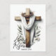 Ein friedliches christliches Kunstwerk, das das leere Kreuz mit symbolischem weißen Tuch, Dornenkrone und sanften floralen Elementen darstellt und die Hoffnung auf die Auferstehung nach Matthäus 28,6 hervorhebt.