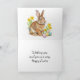 Diese gefaltete Feiertagskarte zeigt ein charmantes Hasendesign, ergänzt durch lebendige Ostereier und einen frühlingshaften Pastell-Karorahmen. Ein anpassbarer Gruß ist im Inneren enthalten, was sie zu einer idealen Wahl für Familienfeiern macht.