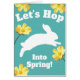 Ostergrusskarte mit weißer, sonniger Silhouette, goldenen Blume und einer weißen, sonnigen Silhouette mit den Worten "Lasst uns in den Frühling springen".