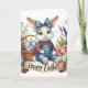 Eine hübsche Osterillustrierung mit einem niedlichen, in Denim-Overalls gekleideten Hasen und einem karierten roten Shirt. Der Hase hat große Ohren mit einem weichen, rosa inneren Ton, einem süßen Ausdruck und einem großen blauen Bogen, der auf seinem Kopf gefesselt ist. Um den Hasen herum gibt es eine festliche Anordnung von pastellfarbenen Ostereiern, einem Korb, Frühlingsblumen und Schmetterlingen. In einem Band unten wird die Meldung "Happy Oaster" angezeigt.