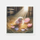 Ein flauschig rosa Küken sitzt in einem Nest, umgeben von zerbrochenen Eierschalen mit einem rosa Gingham-Muster in einer Scheune, während das Sonnenlicht durch die Holzlatten strömt und die gemütliche Szene erhellt.