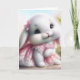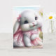 Ein niedlicher, flauschiger Osterhasen mit einem zarten, rosafarbenen Spitzenkleid sitzt in einem traumhaften, blumigen Ambiente. Alle Texte können geändert werden.