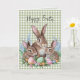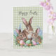 Niedliche Aquarellfamilie Bunny mit dekorierten Ostereiern und Blume auf einem grünen und weißen Gingham-Muster. Alle Texte können bearbeitet werden.